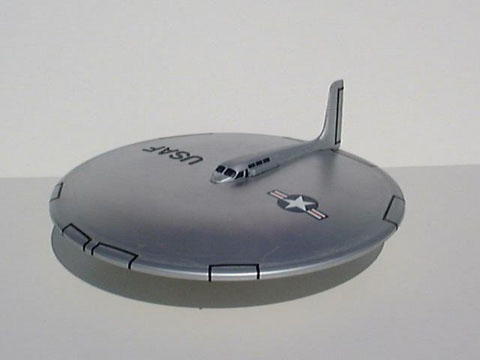 DESCRIPTIONS OF THE DISCS: When Jack first saw the official USAF photos of these aircraft, he was amazed, and immediately asked questions regarding how large, and how many of these aircraft were built. Jack also inquired about the flight performance (altitude and cruise speed) for these aircraft. Some of the in-flight photos clearly showed the discs being escorted by an F-84 Thunderjet (straight-wing) interceptor aircraft. Looking head on, they appeared as the classic so-called "Flying Saucer" shape, very similar to two saucers stacked one over the other. The pilot/crew compartment appearing as a bubble shaped contour located directly in the middle of the top of the disc. There was nothing forward of the pilot's compartment other than the sloping surface. That compartment tapered back towards the trailing edge of the disc, narrowing down to a high vertical tail. The small 20' diameter craft had a crew of one, with an air-intake on both sides of the pilot's compartment, and two exhaust ports at the aft lower portion of the disc. This aircraft also employed control surfaces along the circumference of the disc. According to Jack, the smaller disc seemed to incorporate a sort of magnifying/enlarging optical sight, which was directly embedded into the 1-1/2 to 2" thick canopy windows. The standard Air Force insignia, and the word "XPERIMENTAL" followed by "USAF", was visibly printed starting immediately behind the windows of the compartment on towards the tail. All four discs were polished aluminum silver in color, with the aircraft skin seams and rivets clearly visible. Amazingly, each aircraft was so exceedingly streamlined that it appeared as though each craft were made out of one piece. The discs themselves, regardless of size, all had tricycle landing gear. The size of the aircraft, determined how many wheels on each. According to the O.I.C. (Officer in charge) of MacDill, all four aircraft had been flown in, and then immediately parked outside at the scrap-yard. The O.I.C. also informed Jack that not one person had ever been allowed to enter any of the discs since they arrived.